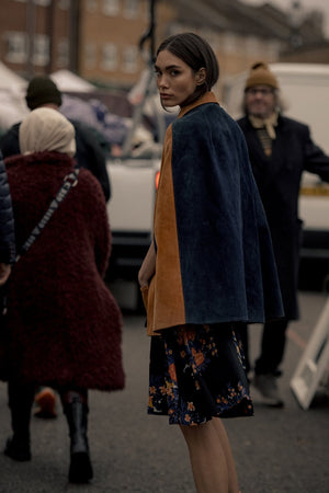 This rust brown and navy suede poncho was sourced from British Columbia.
